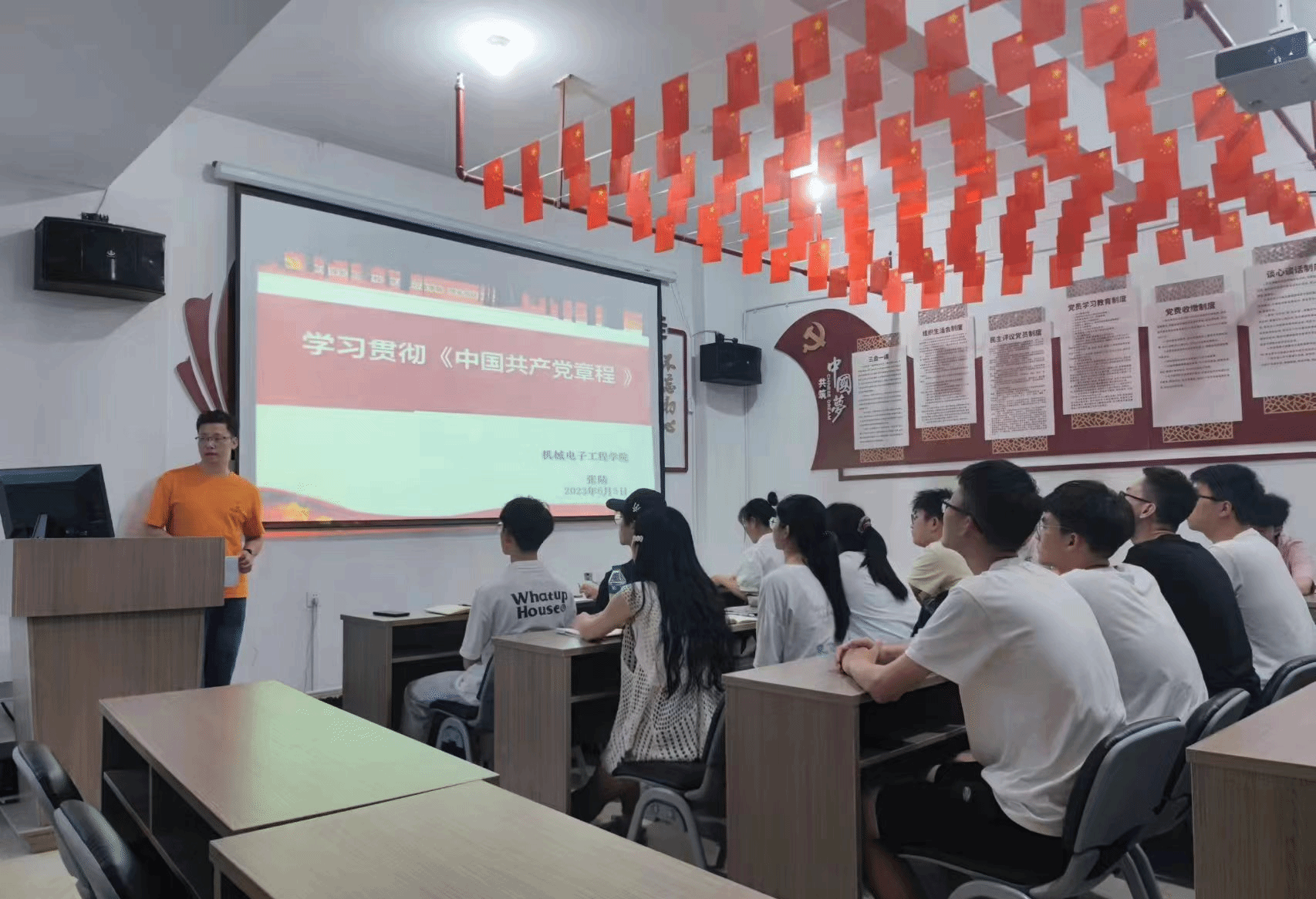 2023年6月5日晚上19:00,yl23455永利集团辅导员张陆老师在18栋“红管家”154教室带领机电学院第一学生党支部30余位学生入党积极分子共同学习了《学习践行党章,争做合格党员》。