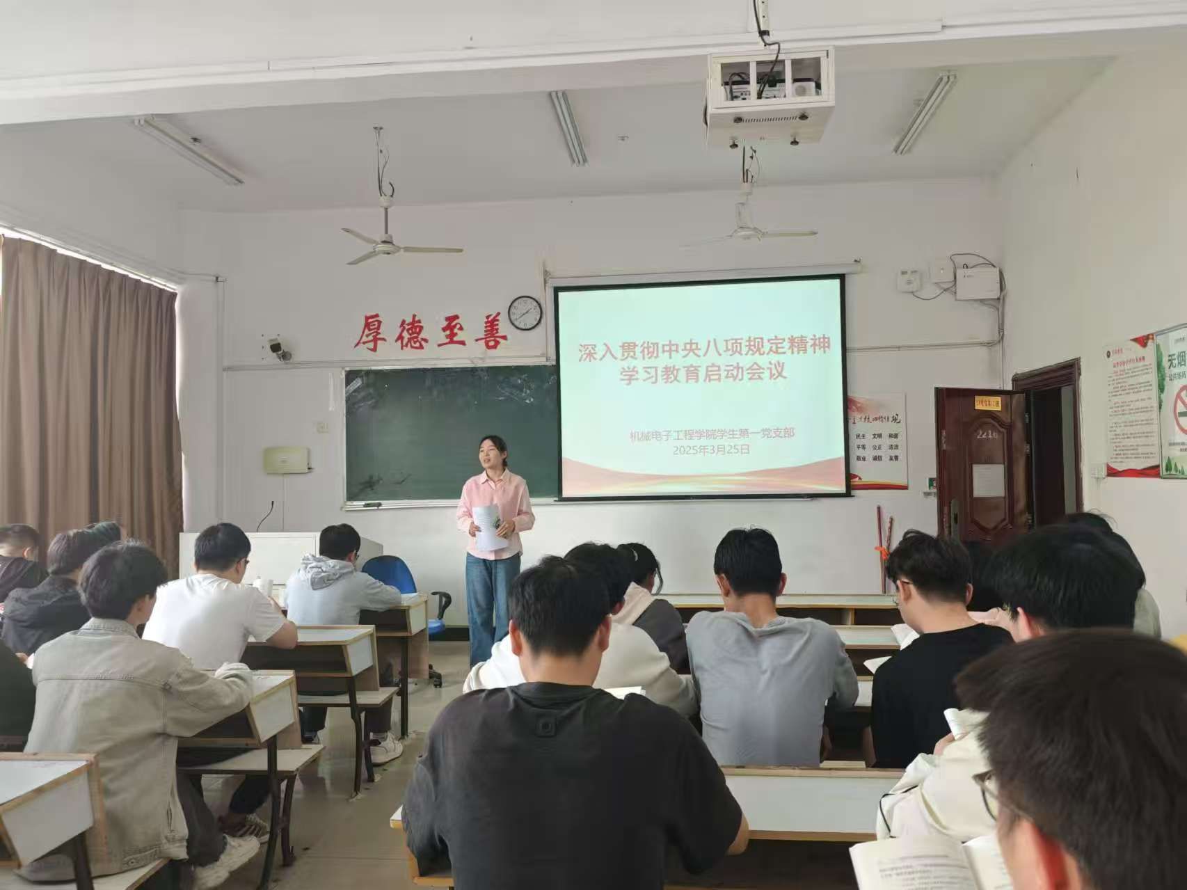 3月25日下午,yl23455永利集团学生第一党支部、第二党支部在鼎新楼2216教室召开深入贯彻中央八项规定精神学习教育启动会议,深入学习贯彻习近平总书记关于深入贯彻中央八项规定精神学习教育的重要讲话和重要指示精神。学生第二党支部书记杨芳主持会议并作动员讲话,学生党支部全体党员参加会议。