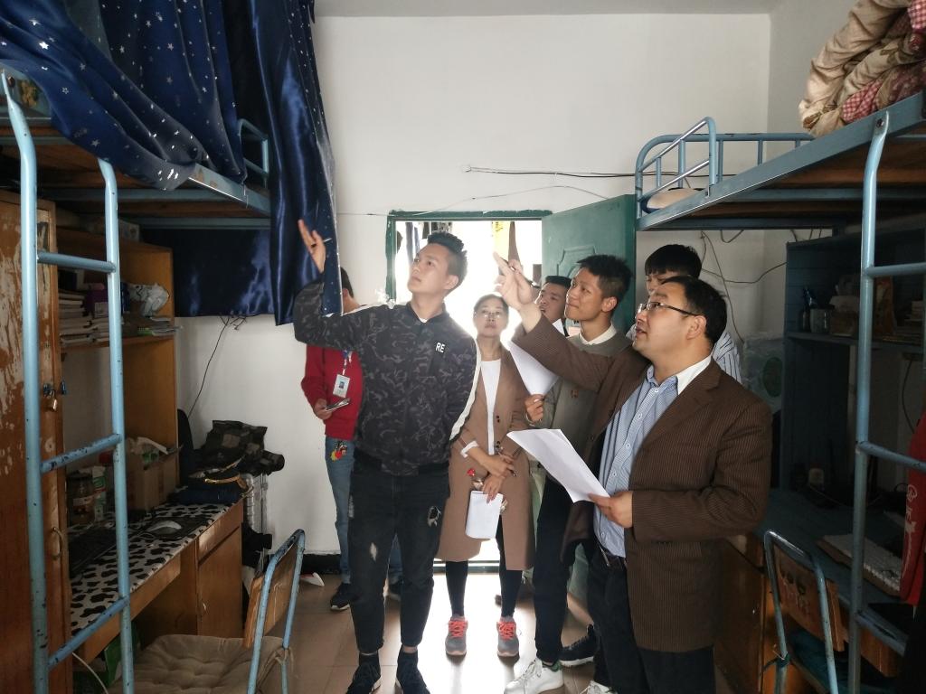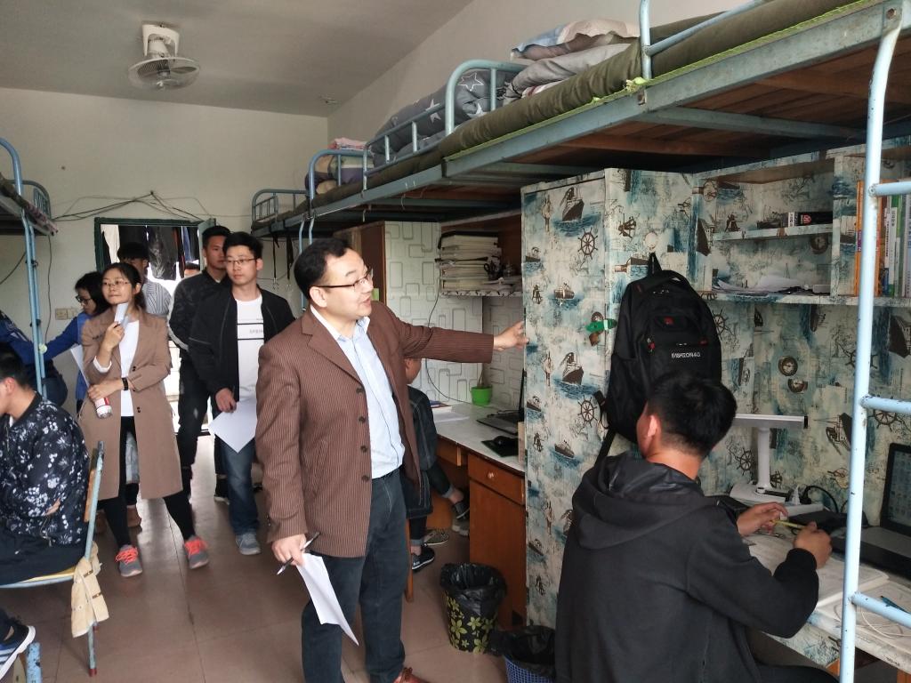 4月16日中午,机电学院副书记王立平、辅导员张陆以及各班班主任带领学生会人员走进学生宿舍进行了检查评比。学生们的精心设计、精彩创意、精心布置让评委们连连称赞。寝室中各式各样美丽的装扮,为寝室点亮了一抹亮光。爬山虎样式的壁纸,绿色妆点了寝室的原木色彩;写字台前的励志名言,彰显了学生们自我的抱负。老师还与学生们打趣交流,询问学生给寝室是怎么装扮的,有没有遇到什么困难,也使得检查多了一份乐趣。