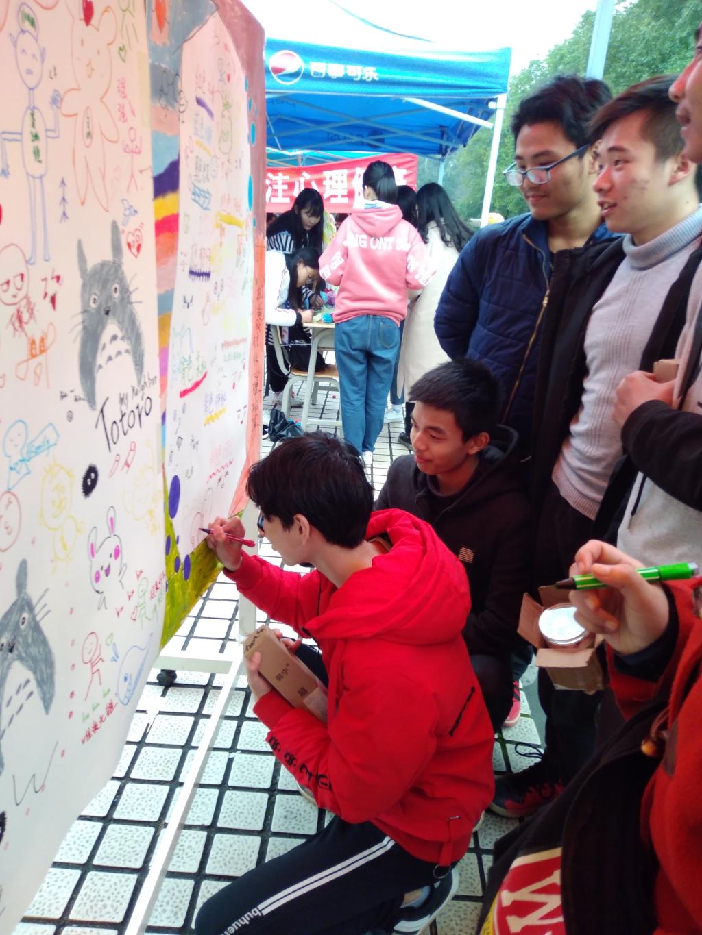 为缓解大学生心理压力,预防心理疾病,增进心身健康,以积极的、正常的心理状态去适应当前学习,加强对大学生的心理健康教育。2018年12月5日,机电学院和材化学院在中心小广场开展了主题为“1.25要爱我”主题情绪画笔活动。