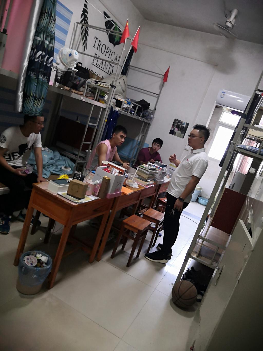 辅导员们重点摸排学生宿舍的大功率电器、天花板漏水等安全隐患,倾听学生们的诉求,关心学生宿舍漏水问题,并积极引导学生网上报修。