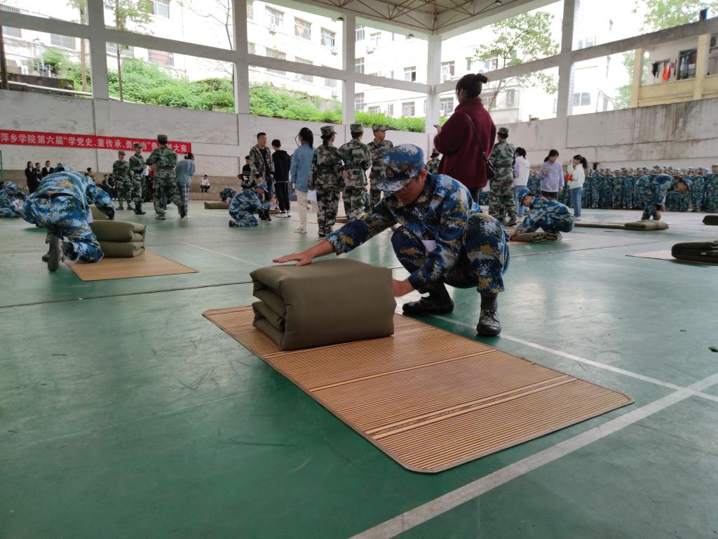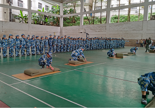 经过紧张的模拟训练参赛选手们跃跃欲试摩拳擦掌随着总教官宣布比赛开始同学们立即进入状态迅速躺下起来蹲下铺平压实翻折抠角捏线熟练地叠起被子5分钟比赛时间里同学们的被子都变成了豆腐块方方正正整整齐齐棱角分明