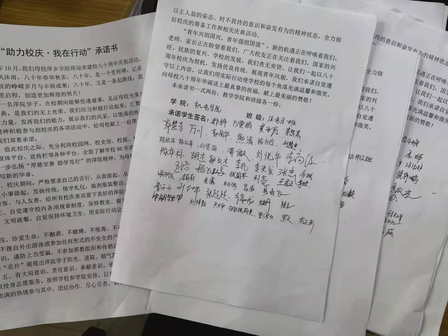 在交流讨论环节,同学们大胆说出自己的想法,校庆来临之际,我能做什么,我该怎么做。加强对教室和寝室的督察,服装整洁,注意自己的仪容仪表,言行要得体,要有大局意识,奉献意识,要全力积极投身志愿服务,用饱满的热情参与其中,团结协作,认真参与各项活动。同时,各班级分别组织全体同学签订“助力校庆、我在行动”承诺书。