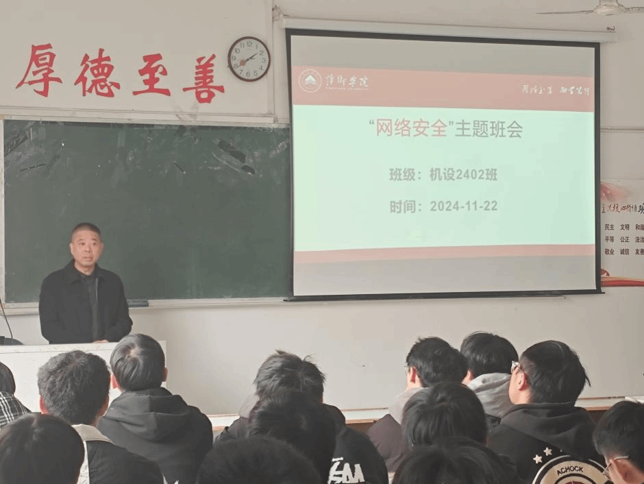 2024年11月22日上午,yl23455永利集团24机设2班在鼎新楼2216教室召开“网络安全”主题班会。班会由辅导员周冀老师主持,yl23455永利集团党委书记王斌作为该班级的“三联系”制度挂点领导参加会议。