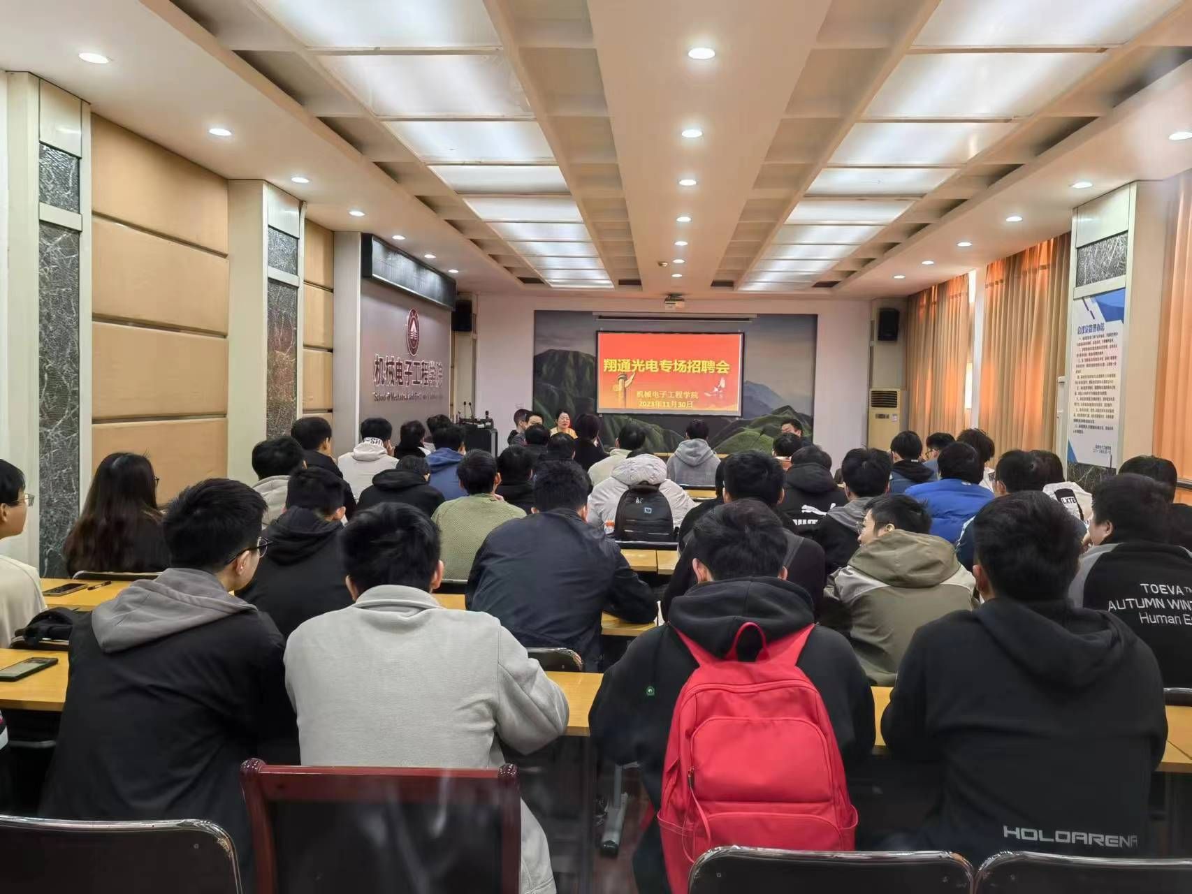 2023年11月30日,中航翔通光电技术有限公司人事行政部部长农艺艳携光无源组件经理贾绍睿、工程部产品经理郭琪一行来到yl23455永利集团,为2024届毕业生举行现场招聘宣讲会。这是中航翔通光电技术有限公司首次来到yl23455永利集团进行毕业生专场招聘。招聘宣讲会现场异常火爆,机电学院的毕业生积极前往参与。
