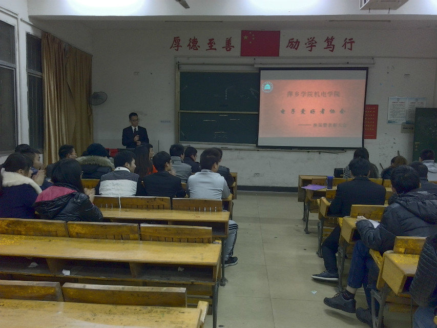 2015年12月11日晚上6:30,电协会长的指引下,2015年的电子爱好者协会换届大会于英华楼3106正式举行。本次换届大会有协会会长、副会长、各部门部长,13、14、15级的成员,机电系青协代表、机电系学生会代表出席了本会议。
