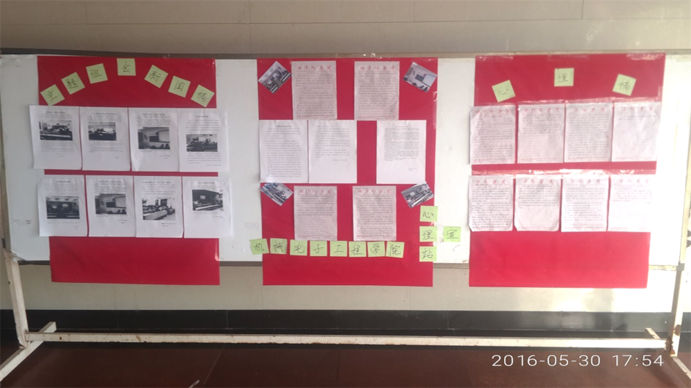 在这些活动进行的期间,我们机电学院同时准备着图文展活动,经过审核,选出了一些优秀的心理主体活动的新闻报道,活动照片,心理稿件,经过系站成员的努力,已将5.25活动月的稿件照片等粘贴在展板上用以展示。