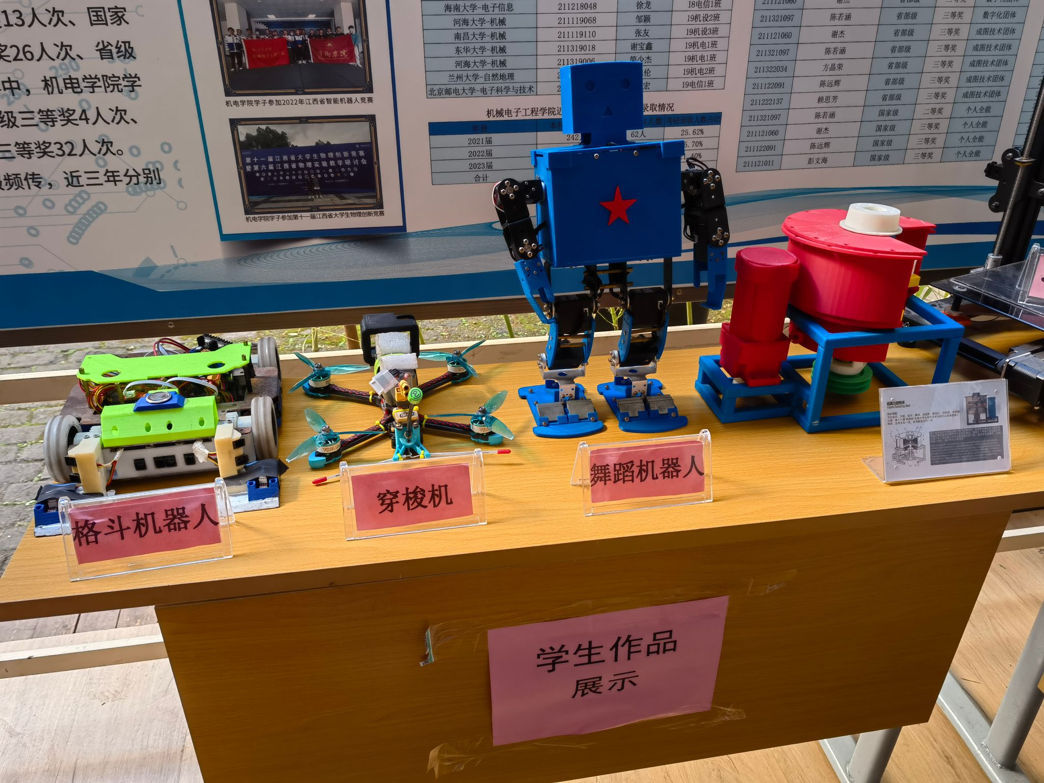机械电子工程学院迎新现场有智能线巡机器人、3D打印机等学生创作的竞赛模型,科创氛围浓厚。