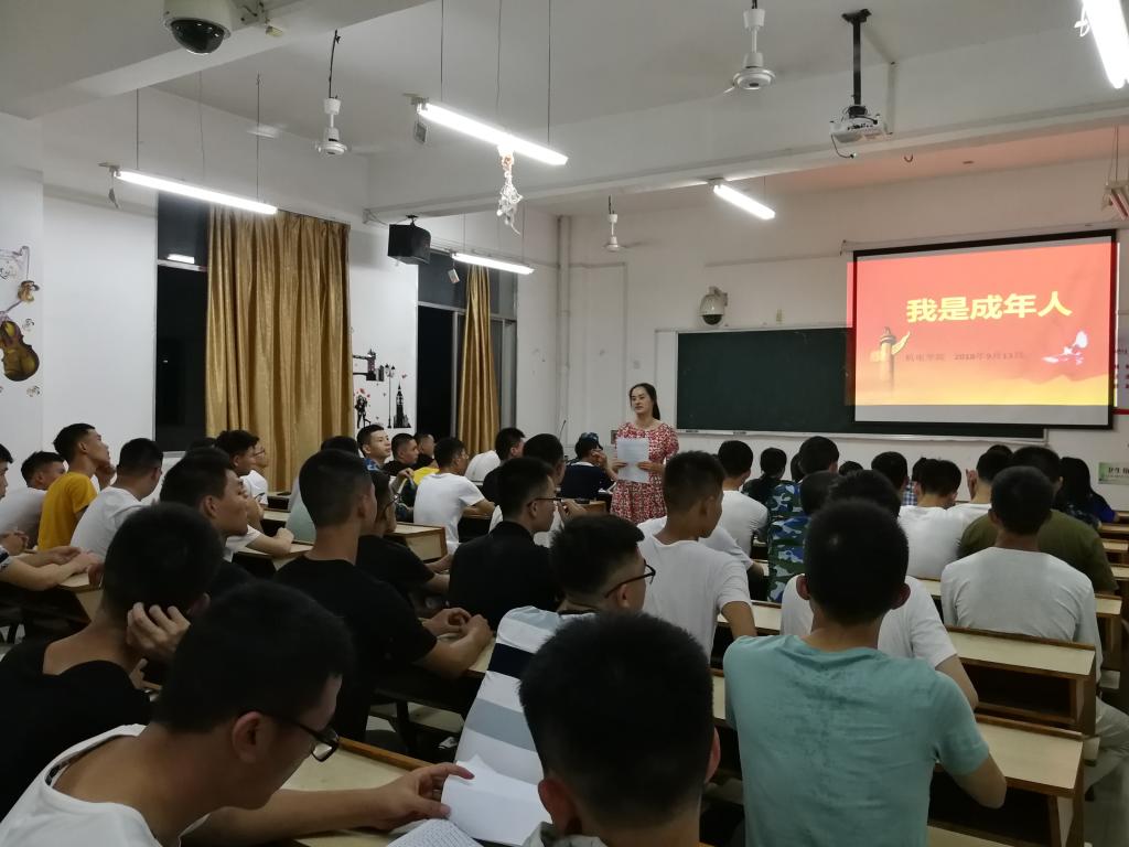 为了深入学习贯彻习近平新时代中国特色社会主义思想和党的十九大精神,2018年9月13日晚上7点整,机电学院于鼎新楼2611、2604、2608教室展开“我是成年人”大学生教育活动,全体18级新生参与其中,主讲人分别为杨芳老师、罗钦艳老师、张陆老师。