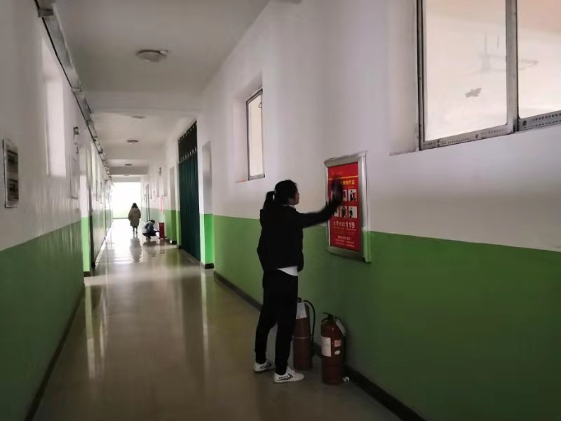 18机设1班、3班同学们,在校英华楼检查和擦拭消防设施。志愿者将楼道、校园打扫得焕然一新。