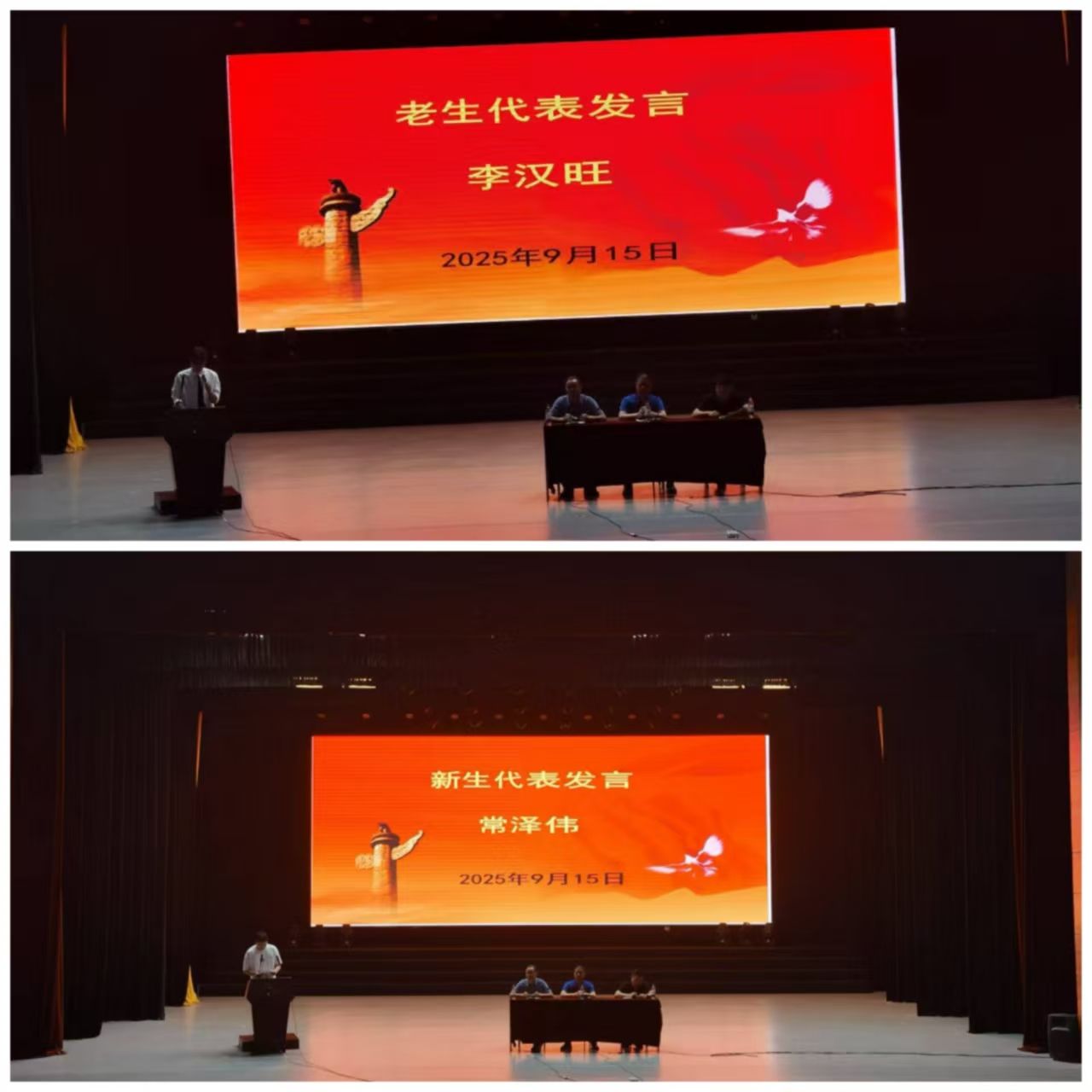 在校生代表2023级机械设计制造及其自动化专业李汉旺向学弟学妹们分享了关于个人成长的思考,他鼓励同学们积极进取,不畏失败,坚定前行,以最昂扬的姿态拥抱即将开启的大学生活。2025级新生代表常泽伟表达了要在新学年新学期踔厉奋发、笃行不怠,展现出新生群体锐意进取的精神风貌。