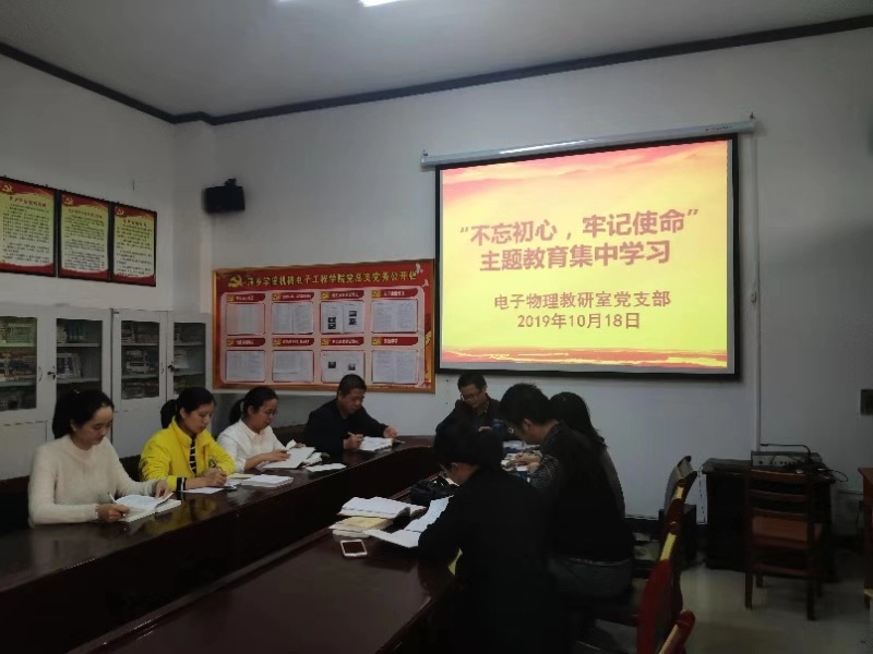 10月18日,yl23455永利集团电子物理教研室党支部全体党员在2216教室开展“不忘初心,牢记使命”主题教育活动,活动由党支部书记李伯勋主持。此次活动中,大家集体学习了习近平总书记对江西工作重要讲话金句,学习了习近平总书记在“不忘初心,牢记使命”主题教育会议上的讲话内容,深刻领会了此次讲话的目标要求和精神内涵。