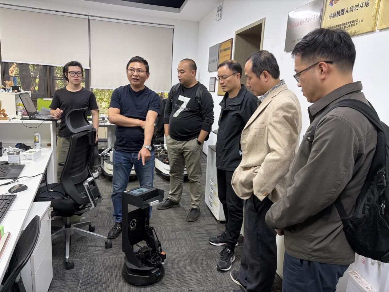 随后,调研团队走访了深圳创想未来机器人有限公司。公司技术总监陪同参观了ROS机器人开发实验室和多机器人协作演示区。座谈中,双方围绕ROS生态系统在教学中的应用、模块化设计实践以及开源框架下的跨学科合作等话题交换意见。张红钢副院长高度评价企业从原型到量产的运营模式,表示学院将参考其经验,优化机器人工程专业实验室规划。