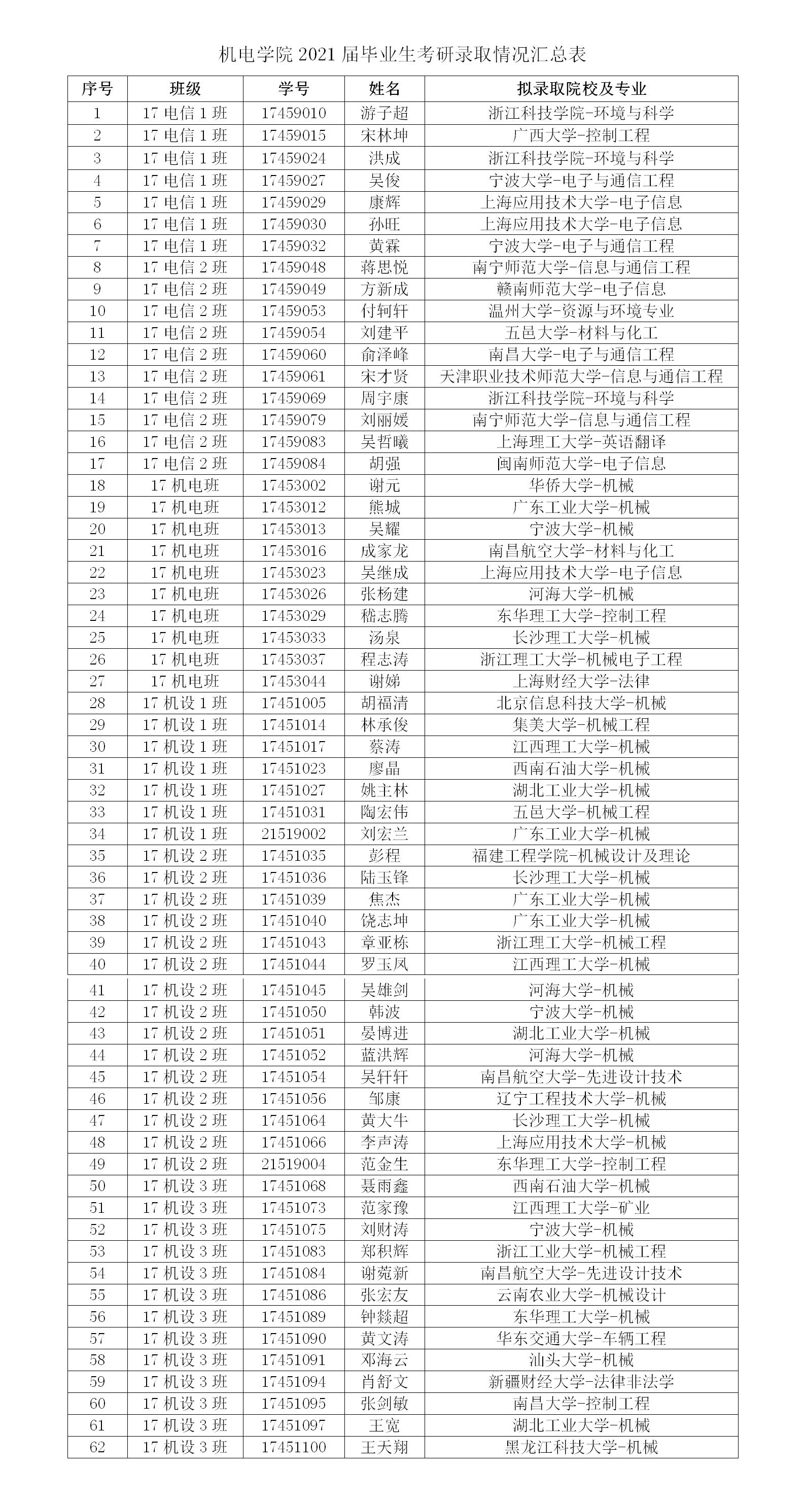 近期,随着全国各高校研究生拟录取结果的陆续公布,机电学院2021届毕业生考研战果捷报频传,现已有62名学生被录取为硕士研究生。今年的考研战果,不管是在考研录取的人数还是录取的质量上,都创造了近几年的最好成绩。据统计,我院2021届本科毕业生共242人,其中有98人参加了研究生考试,有67人过了国家线,现已有62人被录取,录取的学校不乏有上海财经大学、广西大学、南昌大学、河海大学等211院校。