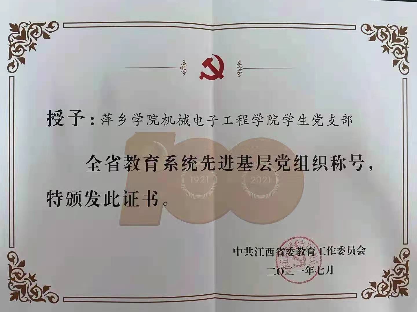 热烈祝贺机电学院学生党支部被授予江西省教育系统先进基层党组织称号