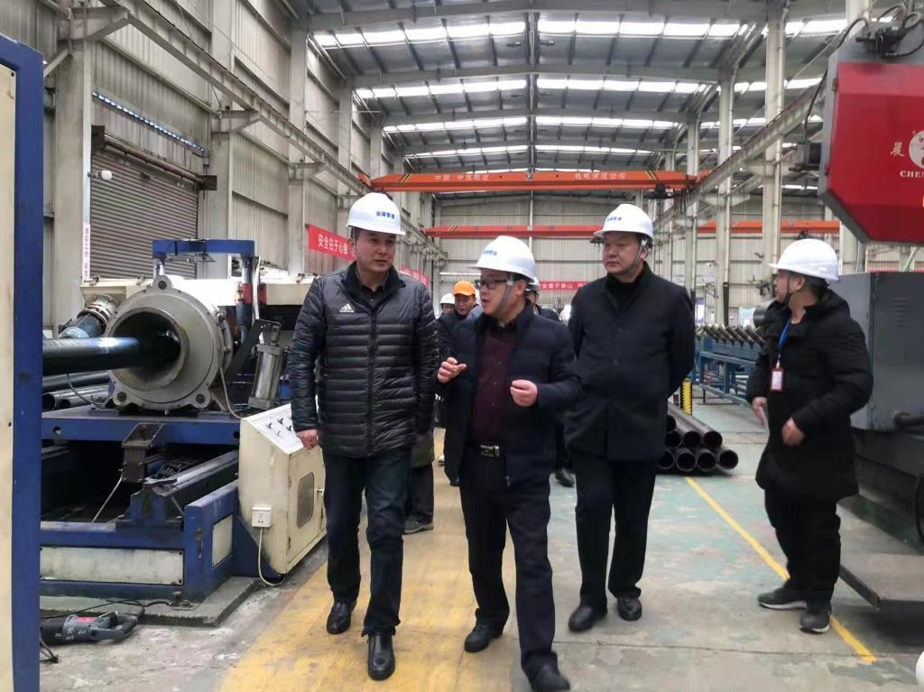 交流座谈前,参观了公司钢骨架聚乙烯塑料复合管生产车间、管件车间和技术中心,了解了公司产品特点、机械设备和生产工艺流程。