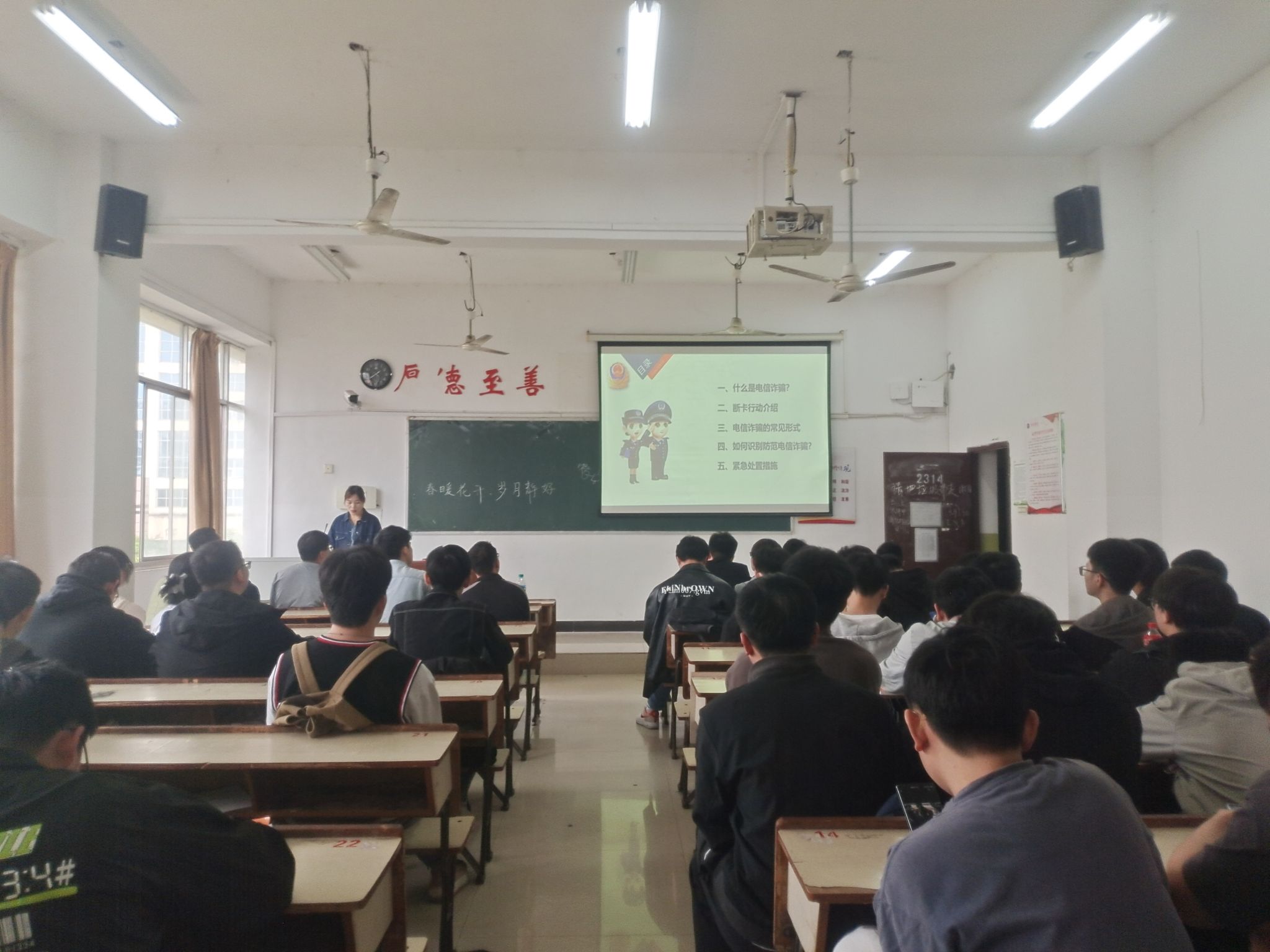 辅导员进班宣讲,提升防范能力。5月份期间,学院各班级组织开展防电信诈骗主题班会和主题团日活动。辅导员带领学生们学习了防范电信诈骗的有关知识。各班组织全体学生签订《防范电信网络诈骗承诺书》。辅导员通过校园案例分析、微视频播放等形式,围绕“什么是电信网络诈骗”、“如何防范电信网络诈骗”等问题进行细致讲解。同时,重点就常见的兼职刷单诈骗、冒充客服诈骗、网络贷款诈骗、网络购物诈骗、冒充公检法诈骗等多种诈骗方式进行逐一介绍,向学生反复强调“电信网络诈骗的常见手段、如何识别防范电信网络诈骗”等方面内容。带领学生学习《中华人民共和国反电信网络诈骗法》,教育学生杜绝“侥幸心理、贪恋钱财”等想法,帮助学生自觉提高防范诈骗的意识和能力。