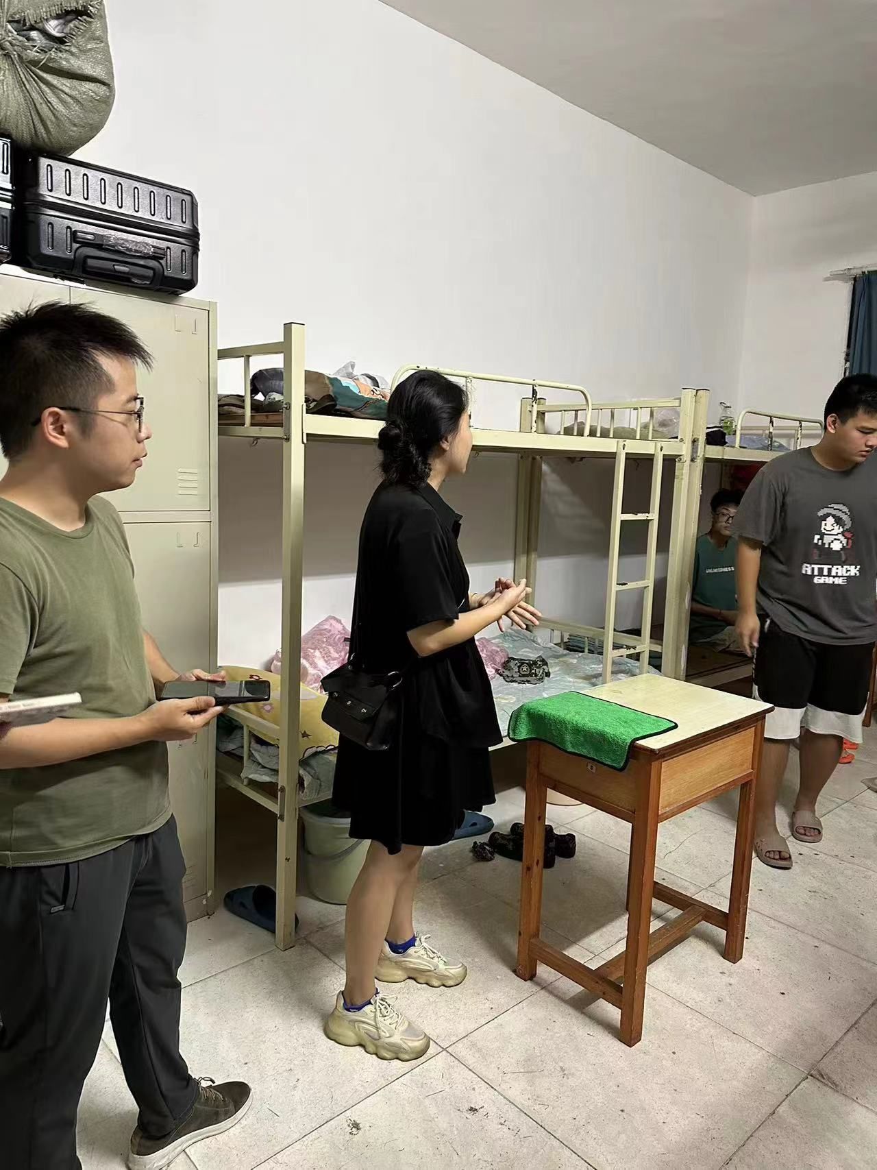 新生辅导员黄鸥来到15栋男生宿舍,与新生们亲切交流,耐心询问是否适应宿舍环境,并细心地指导他们如何正确融入新环境。随后,她对寝室学生进行了安全教育,针对学校关于新生开学近期的工作安排与学生进行沟通交流,并了解了新生入住寝室的感受以及宿舍的硬件设施情况。