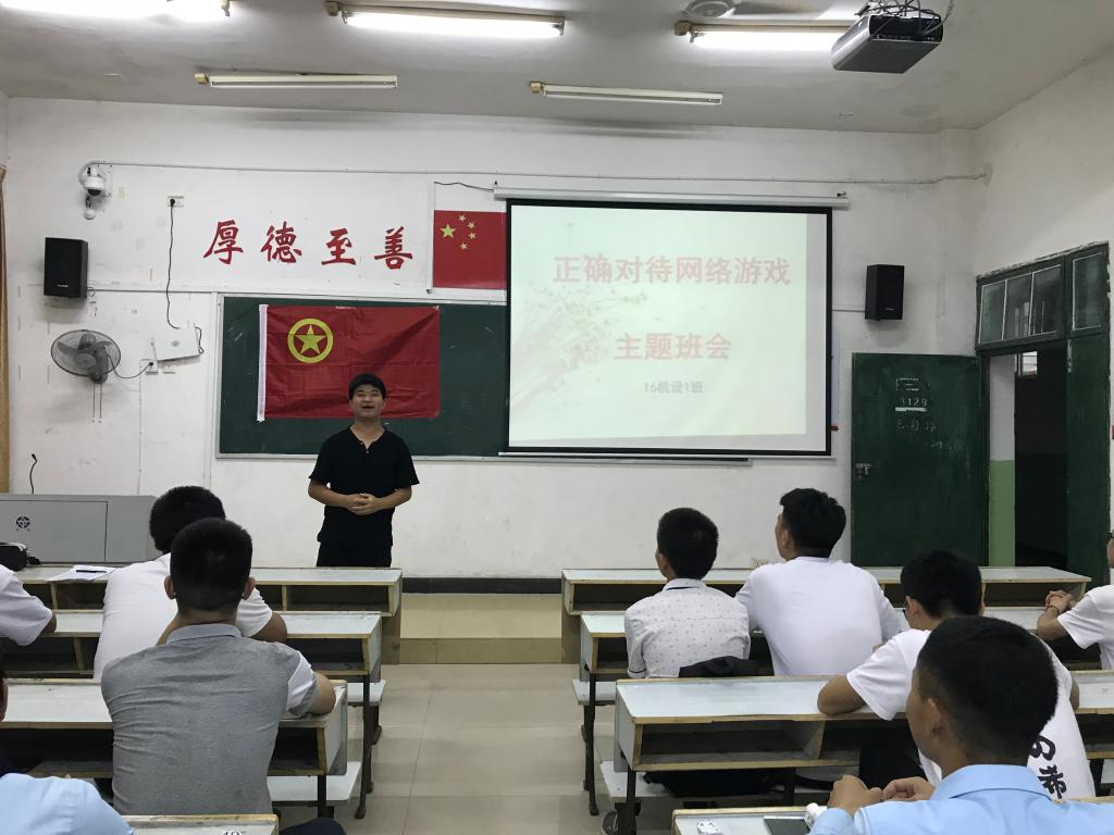 为培养大学生成人自律意识、担当意识,积极践行社会主义核心价值观,引导学生自觉抵制网络游戏的诱惑,2018年5月15日晚上,机电学院16机设1班在英华楼3129教室召开了“正确对待网络游戏,扣好人生第一粒扣子”主题班会。班会由辅导员罗钦艳老师主持。