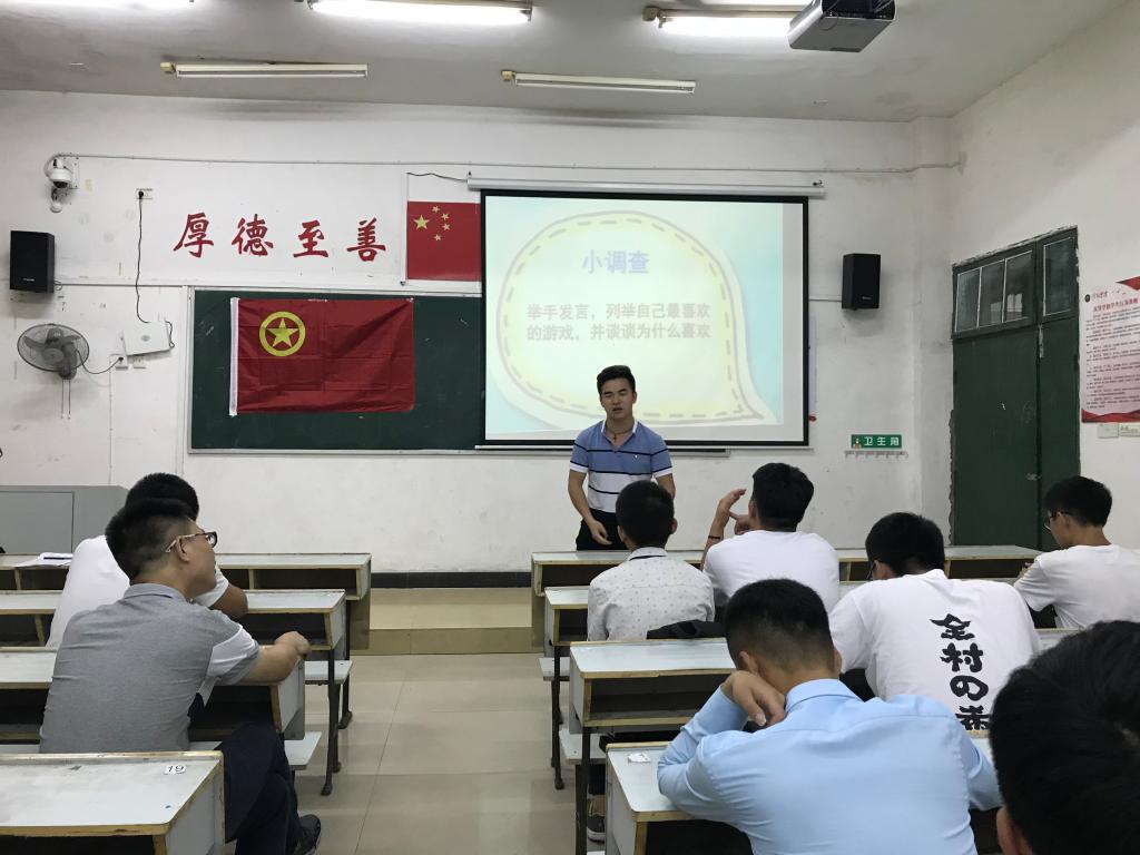 首先,罗老师和班上同学做了一个小调查,由每个寝室派出3名同学上台即兴演讲,谈谈自己喜欢玩的网络游戏、游戏带给自己的感受体验以及对网络游戏的看法与认识。随后,罗老师结合所见所闻,通过PPT的形式,向同学们介绍了沉迷于网游的危害性,重点强调了拒绝网游、珍惜时间,用实例说明沉迷网络游戏所带来的巨大危害,让危机意识深入到了每个同学的心中。
