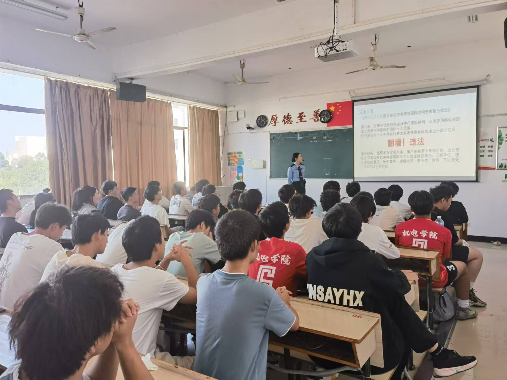 班会上,王嘉慧警官对《国家安全法》和《反恐怖主义法》进行系统讲解,强调两法对于保障国家安全、打击恐怖活动的重要性。随后,通过生动的案例分析,让同学们深刻认识到邪教对个人、家庭和社会的危害,强调了坚持无神论的重要性,鼓励同学们用科学精神和理性思维武装头脑,抵制各种邪教思想的侵蚀。王警官强调,学生们要时刻保持警惕,不轻信陌生人的言论和诱惑;不随意点击不明链接;积极学习科学文化知识,崇尚科学。在互动提问环节中,同学们积极提出疑问,王警官耐心解答,详细阐释了翻墙和邪教的特征和危害,并指导同学们如何识别和防范邪教的侵蚀。