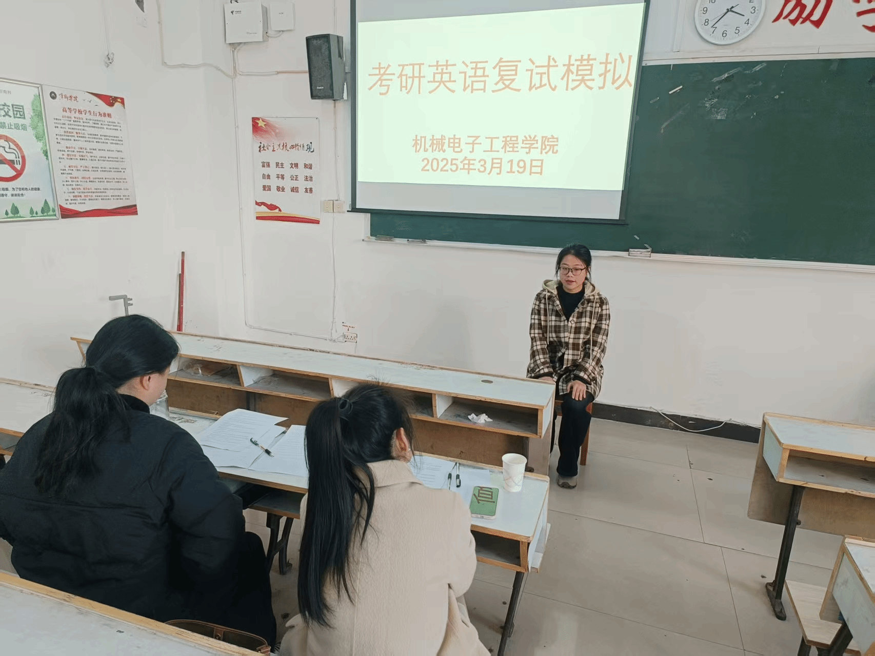 随后,同学们依次进行了3分钟左右的英语自我介绍,现场用英语回答了老师提出的问题。最后,三位指导老师对每个学生的回答结果进行了点评,并给于了同学们改进的措施。面试现场气氛热烈,同学们纷纷表示不仅提前适应了复试氛围,还对复试要求和自身短板有了更清晰的认知,为正式复试积累了宝贵经验。学院将持续关注考研学生动态,提供更加实用的备考支持,助力学生们成功上岸。