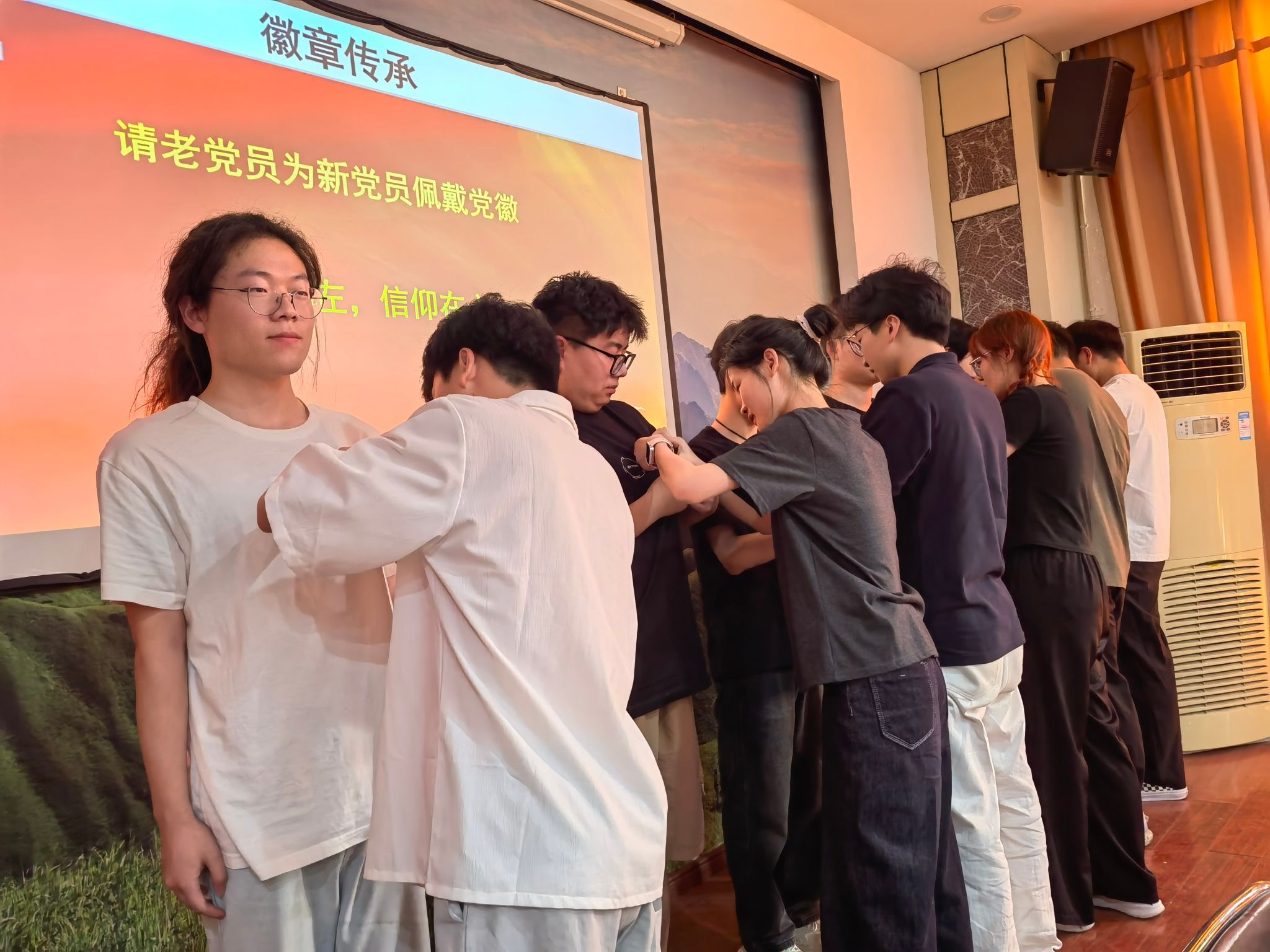 政治生日标志着党员政治生命的开始,记住它,是对信仰的承诺,庆祝它,是对初心的重温。在誓言重温守初心环节,全体毕业生党员面向党旗,高举右拳,在党支部书记的带领下重温入党誓词。“我志愿加入中国共产党……”铿锵有力的誓言回荡在会场,彰显着青年党员对党的忠诚与担当。毕业生党员代表万乐峰表示:“每一次宣誓都是精神的洗礼,未来无论身在何处,都将以行动践行誓言。”徽章闪耀,传承红色基因担使命。在“徽章传承”环节,毕业生党员代表为低年级党员佩戴党徽,一枚枚党徽承载着老党员对新党员的殷切期望,也象征着红色精神的代代相传。