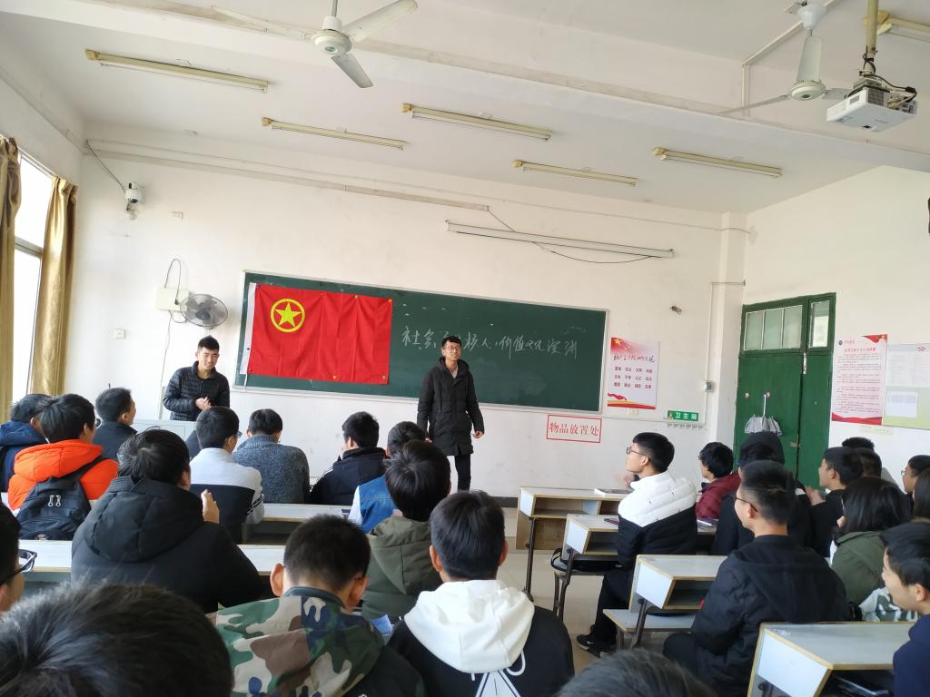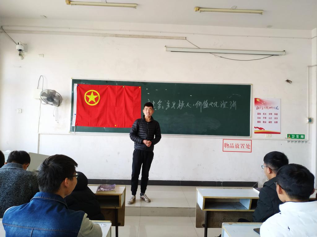 首先,全体同学起立, 一起背诵社会主义核心价值观。接着紧扣主题,从“价值”两字讲起。价值是客体对于主体表现出的积极意义和有用性。那么“核心价值”的重要性便不言而喻了。从价值入手,为的就是启发同学们进行对社会主义核心价值观的深度思考。并引导同学们分别从国家、社会、个人等三个方面讨论价值目标、取向和准则。紧接着,几位同学分别发表了自己对社会主义核心价值观的理解和想法。此环节过去后,团支书又向我们介绍了社会主义核心价值观的发展历程。让同学们了解了它在不同历史时期具体内容的变迁,让同学们感受时代所赋予自己的特殊使命。最后,在学习了其特性后,团支书对本次宣讲做出总结说明其对社会及个人的重大意义。