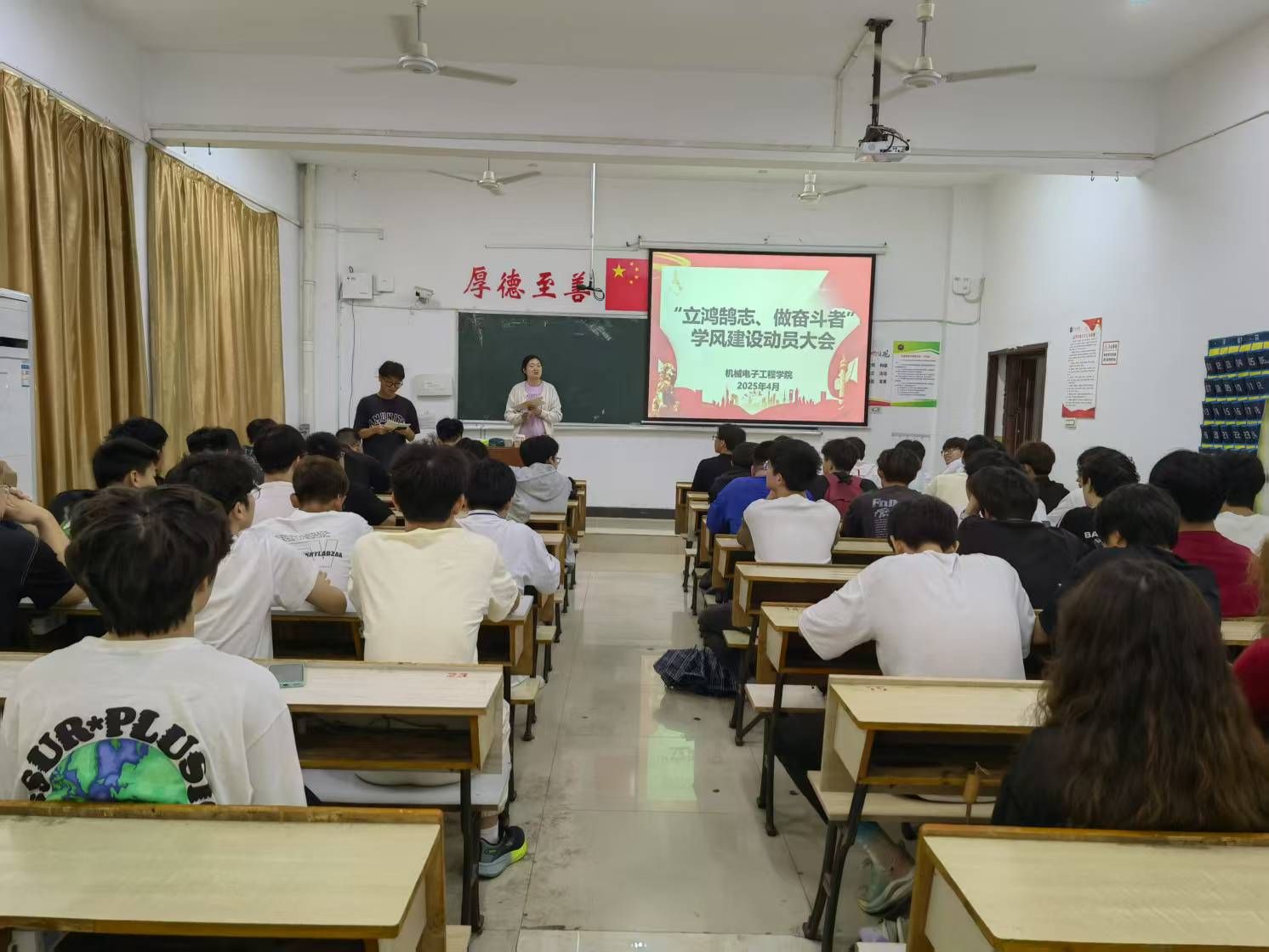 为深入贯彻落实党的二十届三中全会精神和全国教育大会精神,全面立德树人根本任务,进一步营造勤学、笃行、创新的优良学风,激发青年学子立志成才、奋发有为的内生动力,yl23455永利集团于2025年4月22日在鼎新楼召开“立鸿鹄志、做奋斗者”学风建设动员大会。学院党委副书记童乐、各教研室主任主任、全体辅导员及各年级学生骨干、学生代表共计100余人参加了大会。大会由张陆老师主持。