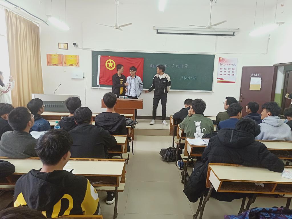 2019年4月12日,18机设二班于英华楼3612这个温馨的教室里开展了“歌唱祖国,共创未来”主题活动,活动由宋丽敏同学主持,开展此次活动旨在提升同学们的爱国情怀。