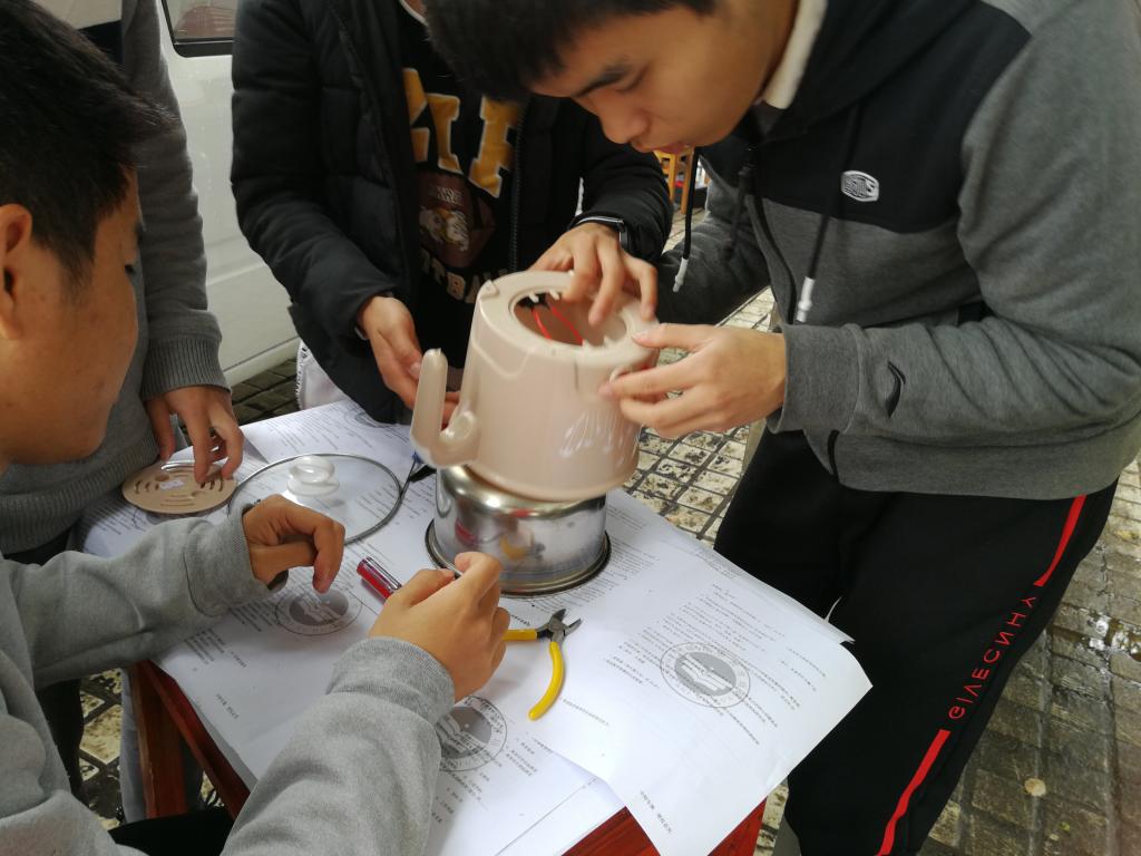 清晨,天空不做美,下起了倾盆大雨,但这不影响维修活动的举行。雷雨交加过后,维修队成员一起从教学楼、办公室搬来桌椅,帐篷来到维修点开始进行工具检查和座椅摆放等前期工作。随后维修点便陆陆续续迎来了送修人群,成员们热情接待前来的同学,认真询问所送电器存在的问题并及时记录。其中,送来维修的器件有吹风机、风扇、电煮锅、电子秤、台灯等。维修成员们干劲十足,对送来维修的小电器认真检测、拆卸、焊接及安装。当看到同学们从自己手中接过修好的电器并感激时,成员们脸上露出了欣慰的笑容。
