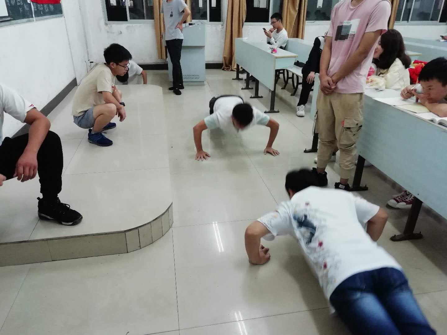 活动开始之前,大家争先恐后报名,一共有8位同学报名参加。选手被分为两组,一组4个,一组比赛,一组作为裁判监督。比赛要开始了,大家都纷纷热身准备。比赛开始,大家都奋力拼搏,许多同学脸都涨红了还在咬牙坚持。比赛结束,最后由赖国强,杨冲,杨江同学获得前三名,他们分别一口气做了70个,65个和63个。活动最后,他们三个分别挑选了奖品,并将奖品——水果与大家一起分享。