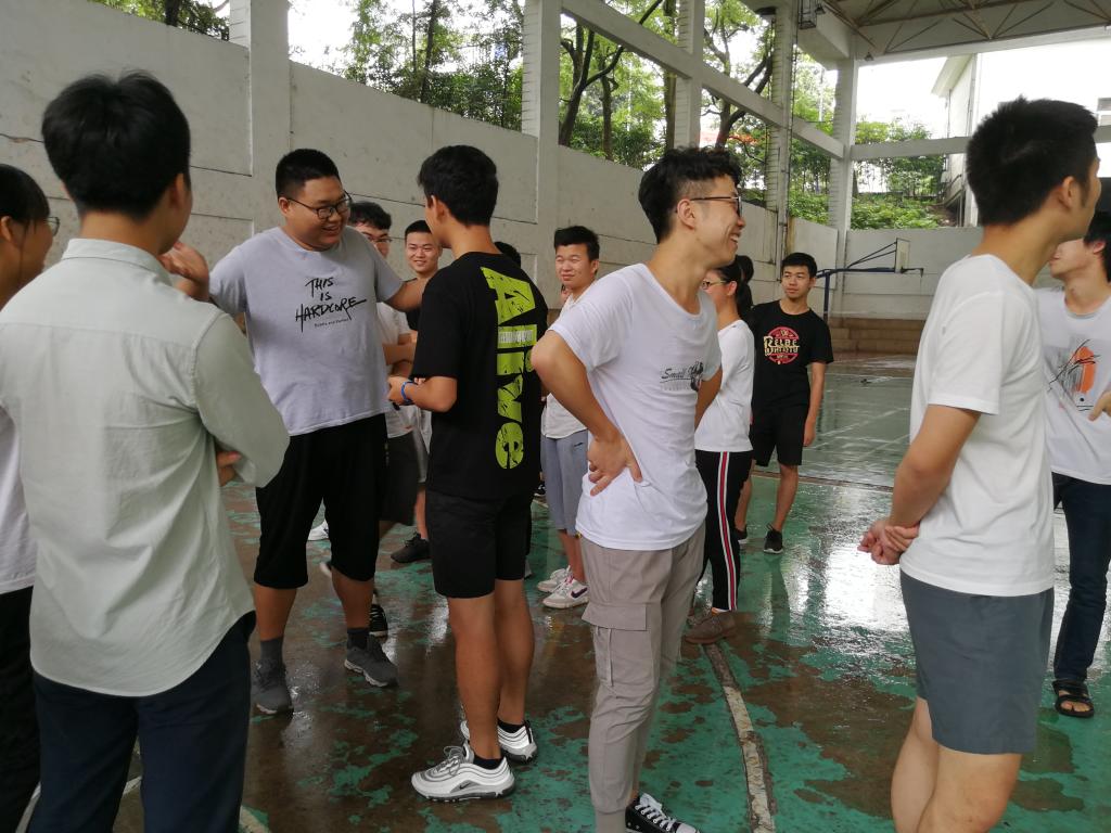 灰蒙蒙的天阴雨绵绵,风雨篮球场上场地有些许湿润,各部门干事早早来到场地集合,听从公关部的安排,大家有次序的搬来了凳子,买来了西瓜,吹好了气球,将场地布置一遍。随着活动的开展,各部门成员们进行了随机分组,每个组在限定时间内选出组长,设计出团队名称。游戏展开初始,主持人向各个团队介绍活动的具体规则,首先进行传声筒游戏,每人仅限肢体语言和拟声词在有限时间内向队友依次传递信息,由最后一位给出答案,答对则获胜,大家的各种肢体动作引起大众们开怀大笑,大家脸上都洋溢着灿烂的笑容。紧接着进行抢凳子游戏,每一组派一位成员参与游戏,胜者有零食奖励,淘汰者进行夹爆气球的惩罚。最后,活动进入最为激动的环节,PK“吃瓜大赛”,每组队伍派一位进行吃瓜,赢了的队伍可奖励吃西瓜,每位参赛成员都在尽力去吃掉大半个西瓜,其他队员们在其旁边不断为他们加油。随着几个游戏的顺利开展,整个素质拓展活动进行的非常顺利。