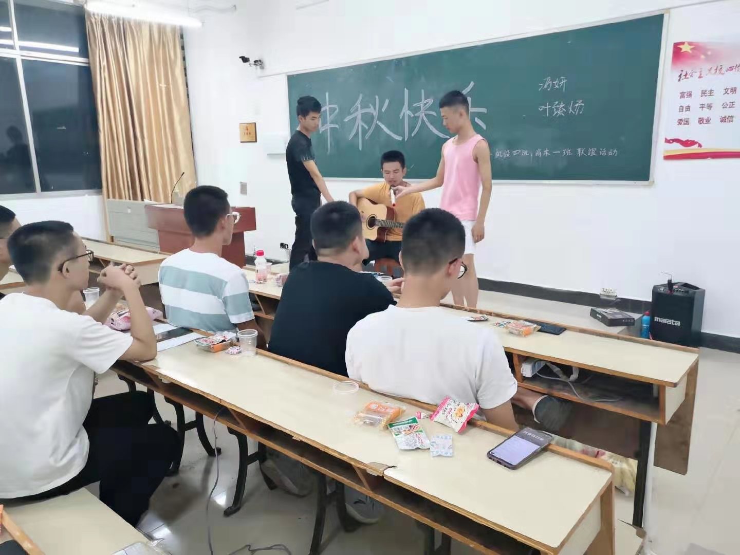 就像古人说的那样“阴晴圆缺都休说,且喜人间好时节”,在两个班级的班委组织下,大家在中秋时欢聚一堂,胜似一家。活动期间,两个班级的同学一同分享水果、零食,一首首歌曲、接二连三的表演节目,将活动气氛推向高潮。歌曲《水调歌头》也牵起了同学们浓浓的思乡之情。辅导员童乐老师也寄语新生同学,希望大家能够做一个精心、精彩、精致的人。