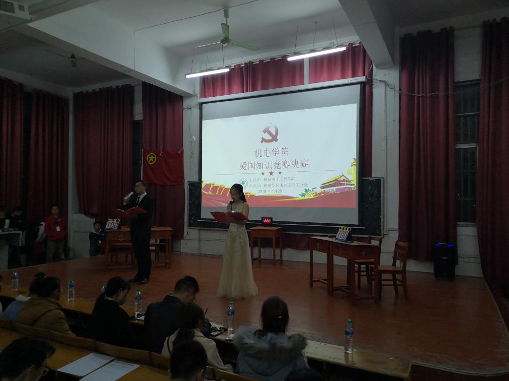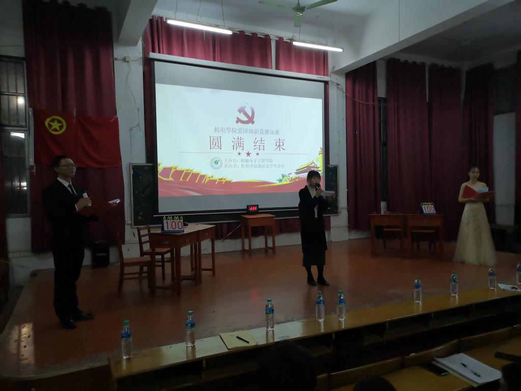 为积极营造“不忘初心、牢记使命”主题教育氛围,进一步培养同学们的爱国意识,使广大青年学子不忘爱国初心。2019年11月25日晚上,yl23455永利集团在跬步楼1115教室举办爱国知识竞赛决赛。参加本次比赛的是在初赛环节脱颖而出的四支队伍,他们分别由19机电二班、19机设二班、19机电一班、19机设四班的同学组成。出席比赛的有罗钦艳老师、欧阳兵老师、李芳老师、张小龙老师。