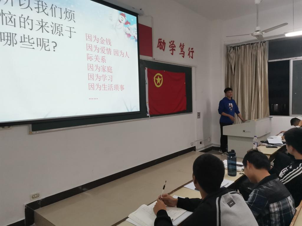 活动首先班级团支书介绍此次活动的流程,明确此次班会的目的,并进行了心理小测试,以选项计分的形式来帮助同学们直面自己的心理压力问题,测试结束后同学们还根据各自的测试结果进行交流分享。接着宣传委员、班长、副班长、文体委员等同学们纷纷上台,气氛十分融洽,昏暗的灯光下,每个人都述说了自己的烦恼。有对爱情的向往;有对亲情的感叹;有对友情的珍惜;更有对梦想的执着台下的观众认真聆听着。也有人说出多跑跑步可以放松心情等方法,压力是人生每个阶段都会存在的东西,如何缓解压力也是每个人应该去学习的事情,只有保持好的状态才能在人生的路上越走越远。