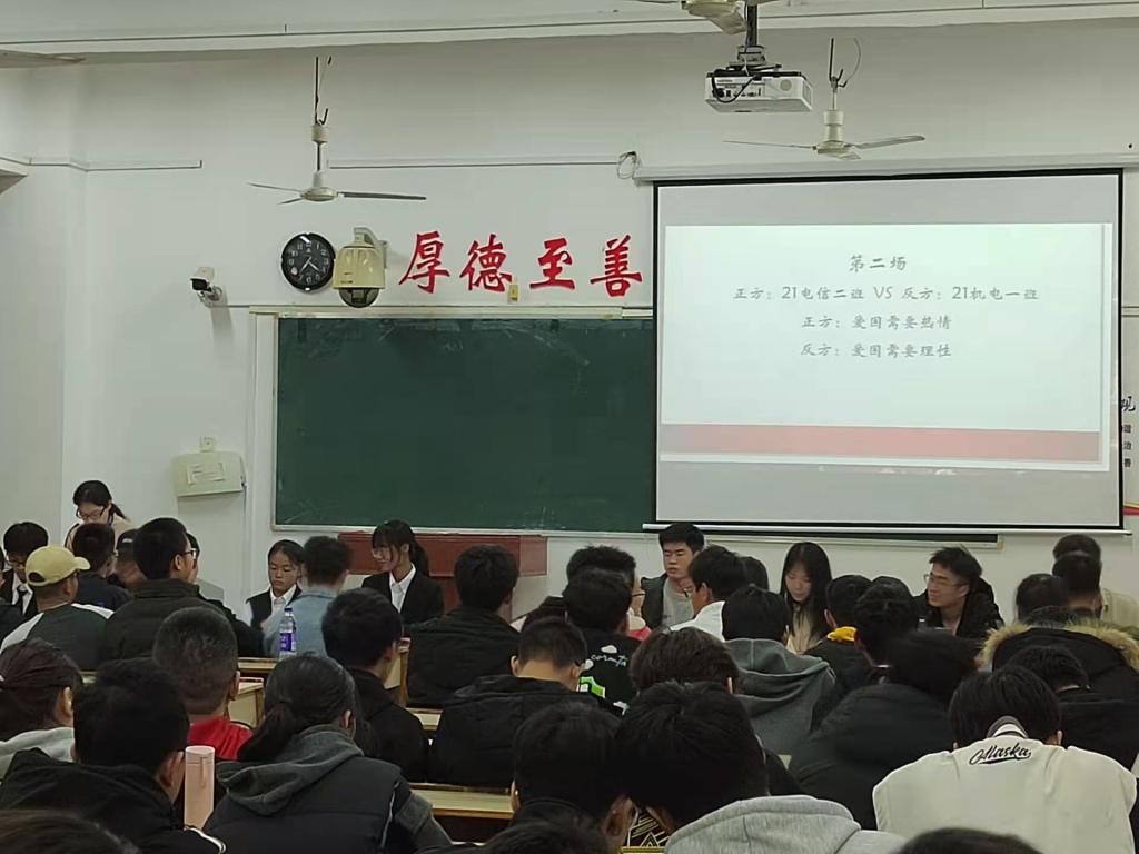 首先由主持人介绍到场嘉宾、正反方辩手以及本次的辩题。正方为“爱国需要热情”,反方为“爱国需要理性”。然后,双方一辩用具有高度概括性的陈述性语句为本场辩论开篇陈辞。之后双方二辩彼此补充陈辞。双方二辩灵活的思维和缜密的逻辑推理,不时的赢得场下阵阵掌声。而到了比赛的第四环节自由辩论阶段,可以说是本场辩论的高潮。面对机电同学的引经据点,旁征博引,21级电信班的辩手们则巧用四两拨千斤的方法,一次一次化险为夷,击破对手的观点。值得一提的是正方三辩同学的流利辩词以及从容应对挑战的态度,更是赢得在场同学的阵阵掌声。最后比赛进入总结陈词环节,双方四辩各自针对对手逻辑上的漏洞逐一回击,为赢得比赛做最后努力。